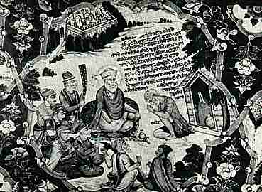 A painting of Guru Nanak at the Lahore Museum (Courtesy F.A. Aijazzudin) Guru Nanak is depicted as a grey-bearded man, seated cross-legged on a rug. He wears a striped 'jama' and a domed turban, decorated with a peacock feather. In his left hand he holds some pages of a holy text and with his right hand he points towards a younger, also bearded man who kneels before him. A servant (possibly Bala) waves a 'Chauri' over the Guru while Mardana, the Guru's minstrel, plays on a 'rabab'. In the near foreground a dog lies curled beside some pots and bags. Behind the figures, is a thatched pavilion beside and above which a banana tree and a fruit-laden mango tree can be seen against the sky. | |||||||||||||||||||||||||||||||||||||||||||||||||||||||||||||||||||||||||||||||||||||||||||||||||||||||||