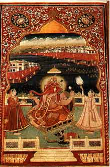 Seeing them again when calling on Ranjit Singh some days later she bristled with irritation at their behaviour and that of their bibulous guardian: 'Those two little brats, in new dresses, were crawling about the floor, and he poured some of this fire down their throats'. Schoefft believed that they received half their fathers' income until they reached the age of fifteen, and if still alive after Ranjit Singh's questionable supervision beyond that age, they were entitled to the whole revenue. (Aijazuddin)." With the collapse of Maharaja Ranjit Singh's kingdom, the art of traditional painting disappeared from Lahore and Amritsar but continued in the other British protected Sikh States like Patiala, Kapurthala, Nabha, Jind, Faridkot and smaller places like Una. In fact, with the peaceful conditions encountered by these states under the patronage of the British, indulgence in the arts and court leisure activities increased considerably. The Lahore court artists soon migrated there and evidence exists of artists reaching there directly from Delhi and even Rajasthan (the Hindu mythological paintings at Sheesh Mahal, Patiala, give it the air of a Hindu palace) |