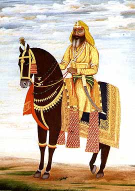| An impartial assessment of Maharaja Ranjit Singh (1780-1839) clearly brings out his great qualities. He converted a lawless region into an orderly and great kingdom - from the Sutlej (almost reaching Simla) including Ladakh, Peshawar, Multan, till the Khyber Pass and Sind. Re used force only sufficient to meet his requirements of maintaining power, and occasionally to obtain a horse that he took a liking to. (It is said that the campaign to get the horse Laili, apart from other objectives, cost him twelve hundred men and sixty lakh rupees). He abolished capital punishment and the smaller abuses and requirements of maintaining power were less gruesome in degree than the total lawlessness that was prevailing before his time. Uneducated and illiterate, he was also a man of the arts though he did not encourage his own paintings, perhaps because of his blind eye and smallpox marks. With great persuasion he sat for a sketch by Vigne, but even then, "He was constantly turning away, so as to conceal his blind eye." Many paintings exist depicting him in his later years but not surprisingly there are hardly any showing him in his youth, which confirms the fact that painting came to the Lahore court after the subjugation of the Kangra hill States. He died a monarch and his authority was not diminished even in his later years when he was paralyzed. He also used to adopt the children of his slain generals and looked after their welfare. "Ernily Eden first noticed them with Ranjit Singh and observed that 'he always has these children with him, and has married them to each other. They were crawling about the floor, and running in and out between Runjeet and G., and at one time the little boy had got his arm twisted around G.'s' leg' To an unmarried forty one year old spinster (and a Victorian one at that) these children violated the primary rule by being not only seen but also heard and felt. | |||||||||||||||||||||||||||||||||||||||||||||||||||||||||||||||||||||||||||||