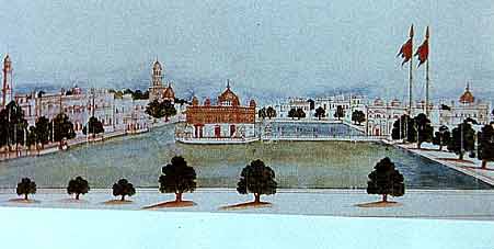 A painting of the Golden Temple by Schoefft done around 1840's, showing the Maharaja listening to either the Adi Granth or the Dasam Granth.