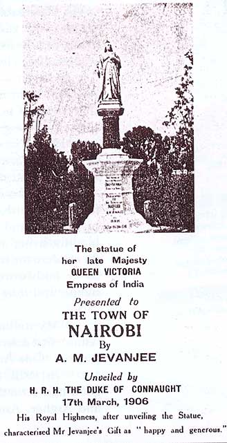 The Duke & Duchess of Connaught unveil a statue of Queen Victoria-the one presented by Mr. A.M Jeevanjee, which stood in the Jeevanjee Gardens also known as Victoria Gardens 1906. Mr. Jeevanjee, a pioneer millionaire, public benefactor in all charitable drives and first member of Municipal Committee of Nairobi. (courtesy we came in dhows)
