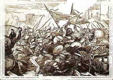The action at Mudki though not significant militarily gave the British their first experience of the fighting qualities of Sikh soldiers. British casualties were heavy and they required reinforcements from Ambala, Meerut and Delhi. Lord Hardinge voluntarily joined the C-in-C as his second-in-command. Tej Singh with his now numerical superiority was supposed to take Ferozepur after overwhelming Gen. Littler, a task not too difficult. Instead he deliberately allowed Gen. Littler to slip out and join forces with Gen. Gough and Lord Hardinge at Ferozeshahr. The Battle of Ferozeshahr After the Mudki setback the Sikhs moved to and entrenched themselves around the village of Ferozeshahr, ten miles from Mudki. Sir John Littler who had affected a junction with the main body of the British Army four miles from the Sikh entrenchment, now decided upon an immediate attack. The British artillery mounted a steady barrage of fire followed by an infantry attack, gaining a foothold in the Sikh entrenchment. The Sikh infantry drawn up behind its artillery guns retaliated with fierce musketry fire and the British were hurled back with heavy losses. The next British charge succeeded in wresting advantage from the Sikhs, the contest continuing with greater determination throughout the night earning it the appellation "night of terror". The position of the British grew graver as the night wore on. |