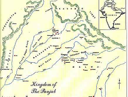 By sheer force of his personality Maharaja Ranjit Singh, born in 1780, became the unquestioned ruler of the Punjab from 1799 to 1839, his kingdom being the last bastion to hold out against the British-a symbol of their incomplete conquest of India. Relying on unconventional statecraft and dazzling display of daring and courage, he wielded his warrior nation to extend the Empire from the Sutlej to Kabul in Afghanistan and from Ladakh to Iskardu and Tuklakote in Little Tibet. Every invasion of India till then had been from west to east across the Indus, from 2000 BC onwards, when the Aryans came in. For the first time in history, an Indian, Maharaja Ranjit Singh, went westwards, crossed the Indus River in 1826, going right onto Kabul. The British followed him, but with his assistance. In the south, he acquired the Cis-Sutlej States. Deciding against an open confrontation with the British, Ranjit Singh chose to enter into the 1809 Treaty with them by which he forfeited his claim to the Cis-Sutlej States, but retained control oyer his existing territories south of the Sutlej, where he had the right to continue policing them with his troops. The British in turn agreed not to interfere north of the Sutlej. Maharaja Ranjit Singh was no fool to sign the Treaty of 1809. He was quite clear about his inability to push his empire across the Sutlej and against the British whose resources were far greater than his own. His future lay westward. |